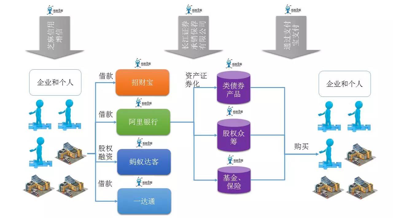 总结来看,这样一个幅员辽阔的版图,证明了蚂蚁金服早已不是当年的支付宝。完整的产品线提供给客户的是一站式服务的顶级体验,而在某些新领域的领先优势是传统金融机构望尘莫及的。拥有不同业务的最大好处是可以跨界经营,某些产品可能单独来看不可能做成或者效益不够高,但是如果一个集团集多个业务单元之力,就能化腐朽为神奇。下面这个图就展示了蚂蚁金服内部一些业务单元联合起来,就已经没有传统金融机构什么事了。